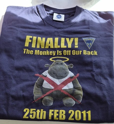 ‘”Finally got the monkey off our back” T shirt, to celebrate a victory against St Helen’s on 25th February, 2011 as Wire beat St Helen’s away from home. First time in 17 years.