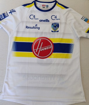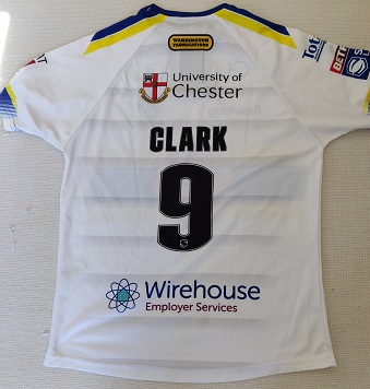 White shirt with yellow, blue, yellow horizontal stripes and Hoover logo. Clark-9 on the back